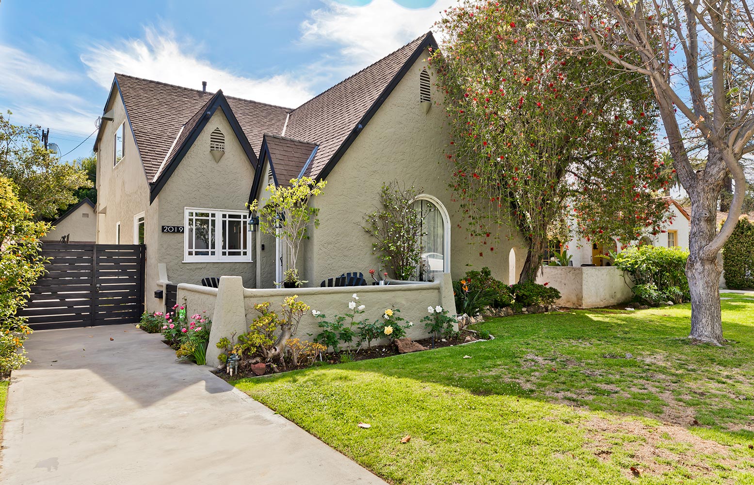 Beautiful, newly updated, 1927 Country English with period charm, gorgeous interior and open floor plan in Prime Westwood! 5 bd, 3 ba with a fully remodeled Chef's kitchen complete with Thermador Appliances, pantries and open flow into a large modern living area in the rear. Custom built two-desk office, remodeled bathrooms and newer hardwood floors throughout. A third-large bedroom on the second level, with a large balcony overlooking the yard and upstairs laundry room, with ample storage all added in 2016. The beautiful backyard has a newer Stone outdoor grill, seating area and environmental “grass” in the backyard with fruiting orange and lemon trees. 2 zone (upstairs and downstairs separate units) heating and AC. Welcome Home!